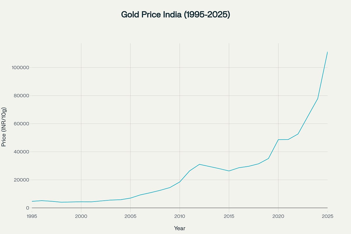 1995-ல் 10 கிராம் தங்கம் சுமார் ₹4,700. இன்று (2025-ல்) அதே அளவு தங்கம் ₹1,01,000-ஐத் தாண்டியுள்ளது. அதாவது 30 ஆண்டுகளில் தங்கத்தின் விலை சுமார் 21 மடங்கு உயர்ந்துள்ளது! இதை ஆண்டுக்கு சராசரியாக பார்த்தால், வருடத்துக்கு 9% வளர்ச்சி.