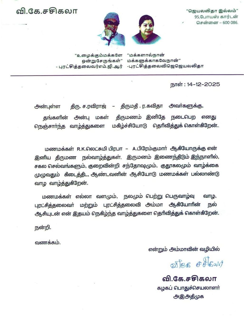 ஜெயலலிதாவின் தோழி வி கே சசிகலா, கவிஞர் வைரமுத்து, இயக்குநர்கள் பாக்யராஜ், விக்ரமன், முன்னாள் அமைச்சர் வைகைச் செல்வன் அகியோர் மணமக்களுக்கு வாழ்த்துச் செய்தி அனுப்பியிருந்தனர்.