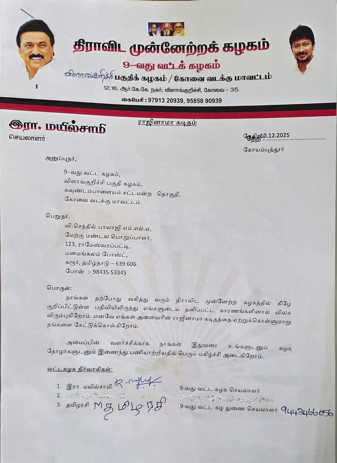 தனக்கு கட்சியில் பெரிய ஆதரவு இருப்பதை காண்பிக்கும் விதமாக அந்தப் பகுதியில் உள்ள மற்ற நிர்வாகிகளிடமும் அவர் கையெழுத்து வாங்கியுள்ளார். கட்சி பதவி ராஜினாமா என்று உண்மையை சொல்லாமல் எஸ்ஐஆர் பணி, கட்சி பதவி நியமனம் என்ற வேறு காரணங்களை சொல்லி கையெழுத்து வாங்கி செந்தில் பாலாஜிக்கு கடிதம் அனுப்பியுள்ளார்.