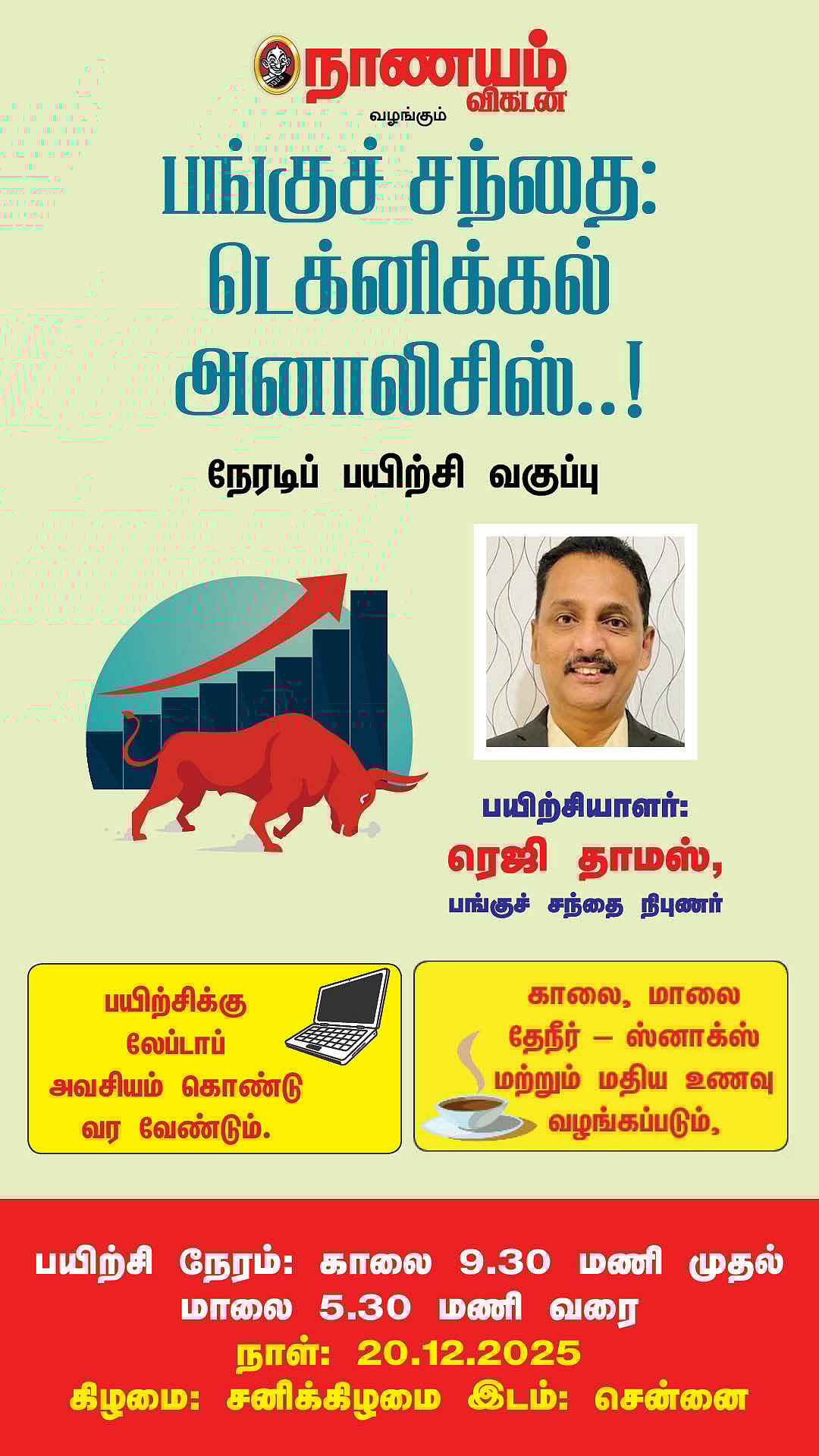 ‘பங்குச் சந்தை: டெக்னிக்கல் அனாலிசிஸ்’ பயிற்சி வகுப்பை சென்னையில் நடத்துகிறது நாணயம் விகடன். பங்குச் சந்தை நிபுணர் ரெஜி தாமஸ் பயிற்சி அளிக்கிறார்.