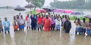 தொடர் மழை நீரில் மூழ்கிய நெற்பயிர்; வயலில் இறங்கி போராட்டம் நடத்திய தஞ்சை விவசாயிகள்!